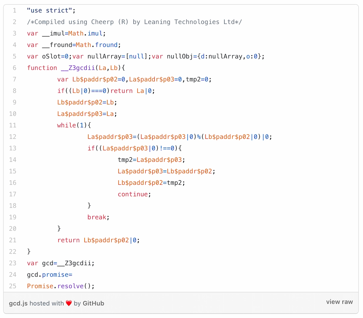 The C++ function has been compiled to JavaScript. You can still recognize what’s happening, there are few casts to integer (to force JavaScript to use 32-bit integers instead of 64-bit floating point math), a loop, a modulo calculation, a swap. Basically the original algorithm has been translated into JavaScript syntax.