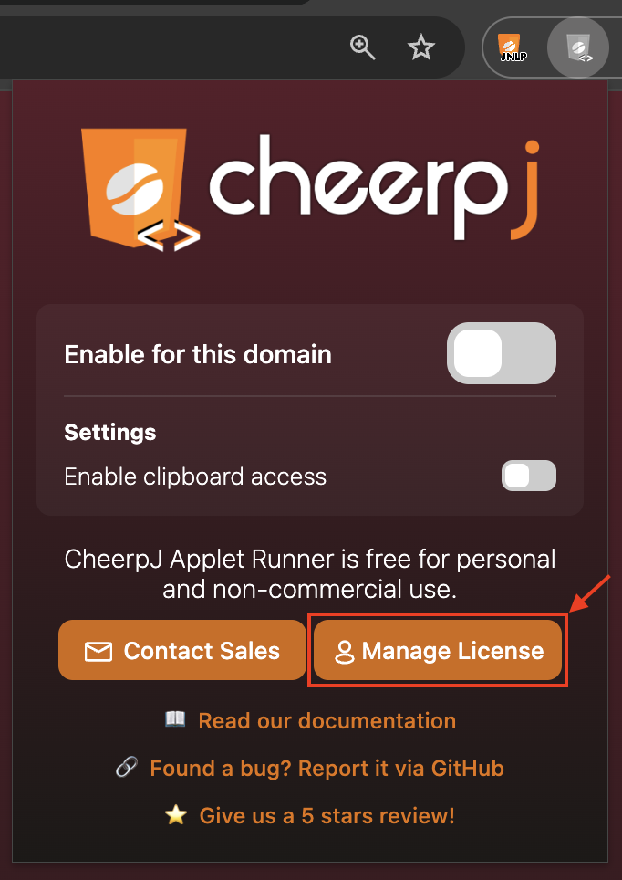 If you have been provided with a license token, you can activate your license offline. From the extensionโs home screen or popup, click on the Manage License link, then select Enter License. Click on the License Token activation checkbox, enter your license token and click on the Validate button.