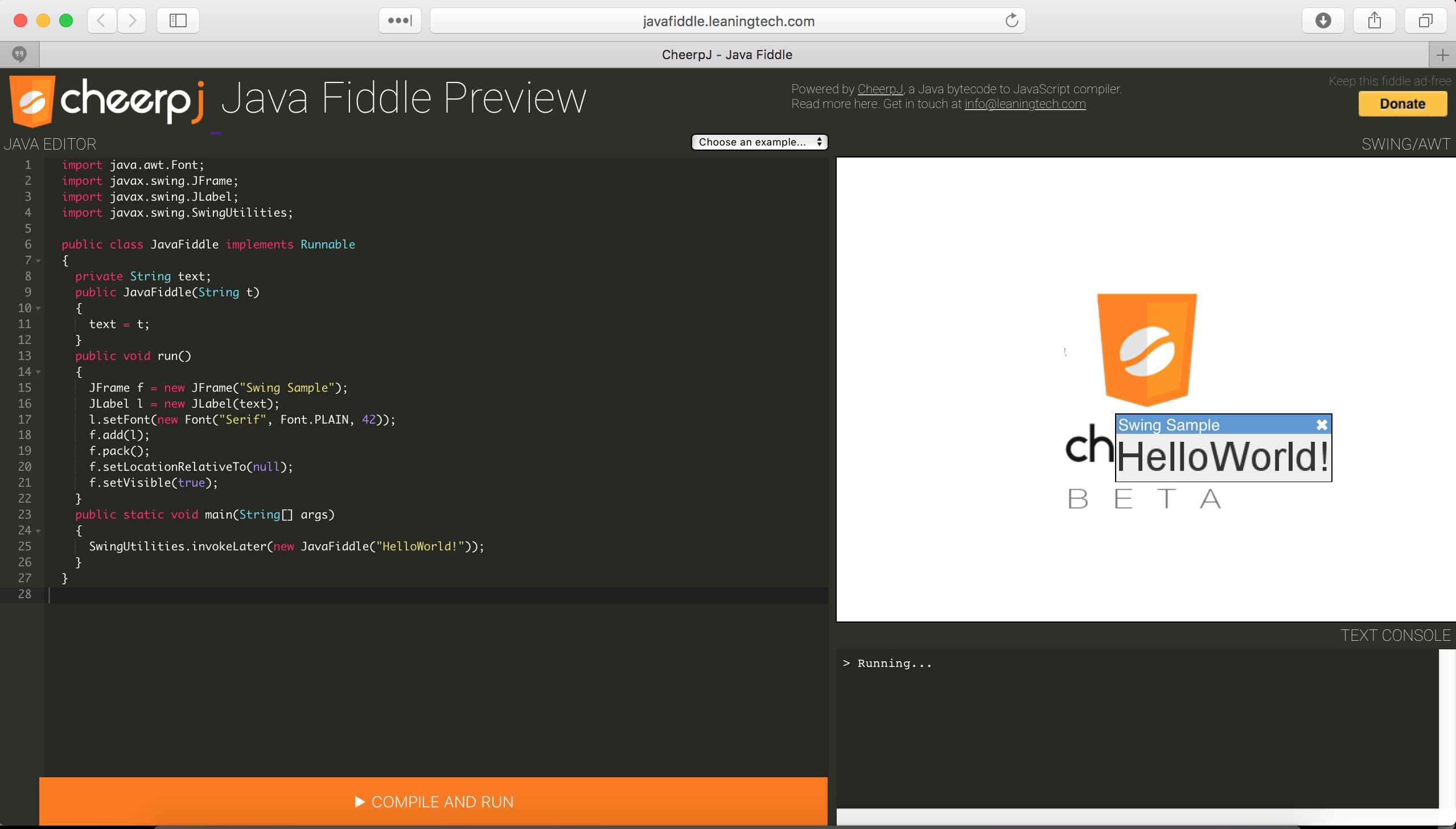 A playground to compile and run Java programs directly in the browser. Both console and GUI applications are supported. The standard javac compiler is used, since javac is also written in Java the whole compiler runs in the browser, together with the compiled application.